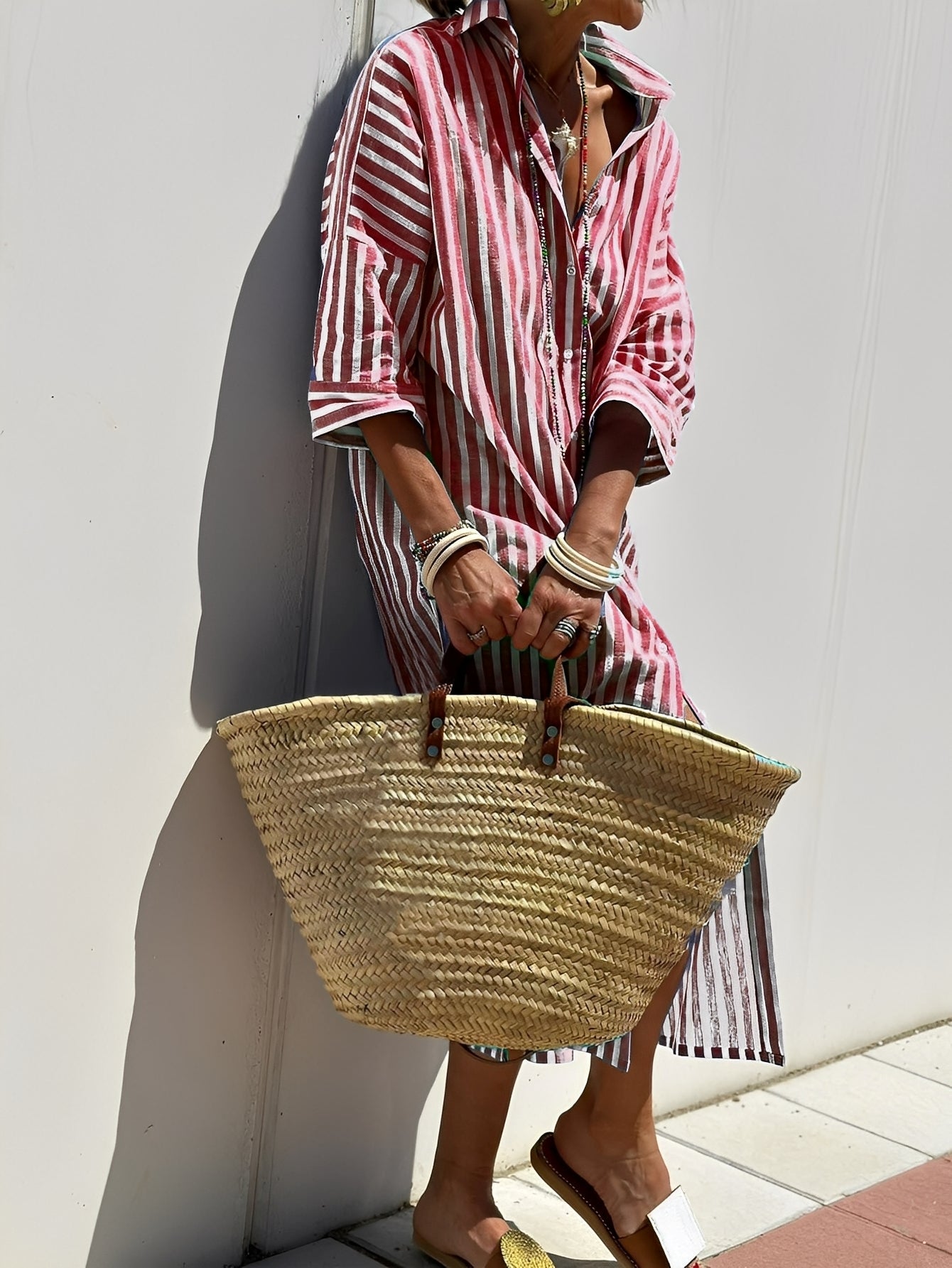 Das Merilyn Kleid aus 100% Baumwolle gibt ein luftiges Gefühl und hat ein klassisches Streifendesign. Das leichte Material ist perfekt für heiße Sommertage geeignet, während der lockere Schnitt Bewegungsfreiheit und angenehmen Komfort bietet. Mit dem klassischen Kragen und den sommerlichen Farben ist es ideal für entspannte Ausflüge und stilvolle Alltagslooks.Deshalb sollte ‚Merilyn‘ in Ihrem Kleiderschrank sein: